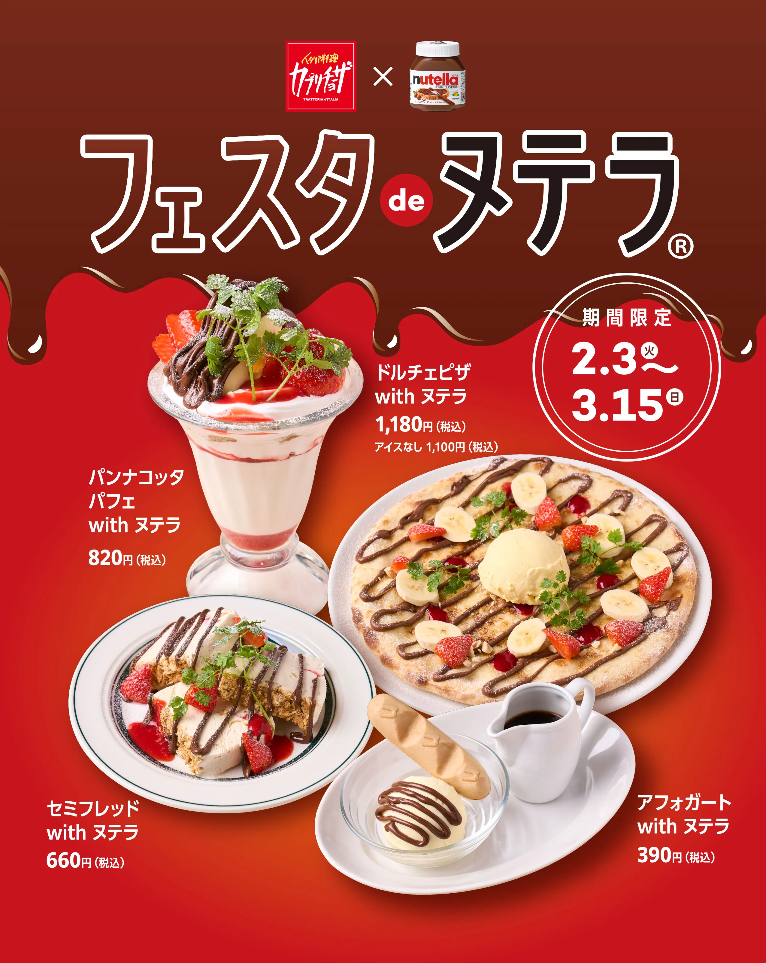 バレンタインデー、ホワイトデーに向け、イタリア生まれのヘーゼルナッツ入りチョコレート風味スプレッド「ヌテラ®」で創作したスぺシャルデザートを期間限定販売!「フェスタde ヌテラ®」では、チョコレートとは異なり、ヘーゼルナッツの香ばしい風味とココアの濃厚でクリーミーな味わいが楽しめるヌテラ®の特徴を活かしながら、カプリチョーザのオリジナリティを盛り込んだ、見た目も華やかなイタリアン・スペシャルデザート4 品を用意しました。